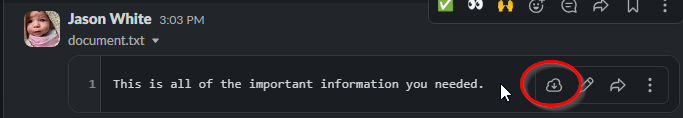 - Navigate to the channel or direct message where the document was shared (in this instance, I will send a Direct Message to myself.) Scroll through the conversation if necessary to find the document you need. Here you can see the document in the red box. This is a preview of the file being sent, so it will always look different than the picture below.