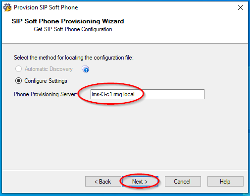 Be sure that “Configure Settings” is selected, and the Phone Provisioning Server is set to ims-i3-c1.rmg.local (this should be set by default). Once the proper server is inputted, click Next.