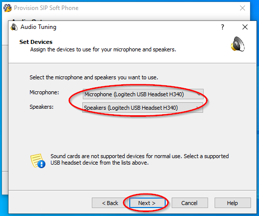 On the next screen, we must set the phone to use the headset. In the two drop downs, make sure the USB headset is selected for both the microphone and speakers. After that, click Next.